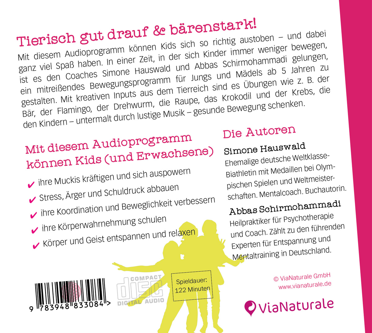 Mit diesem Audioprogramm können Kids sich so richtig austoben - und dabei ganz viel Spaß haben. In einer Zeit, in der sich Kinder immer weniger bewegen, ist es den Coaches Simone Hauswald und Abbas Schirmohammadi gelungen, ein mitreißendes Bewegungsprogramm für Jungs und Mädels ab 5 Jahren zu gestalten. Mit kreativen Inputs aus dem Tierreich – untermalt durch lustige Musik – möchte dieses Programm gesunde Bewegung schenken.