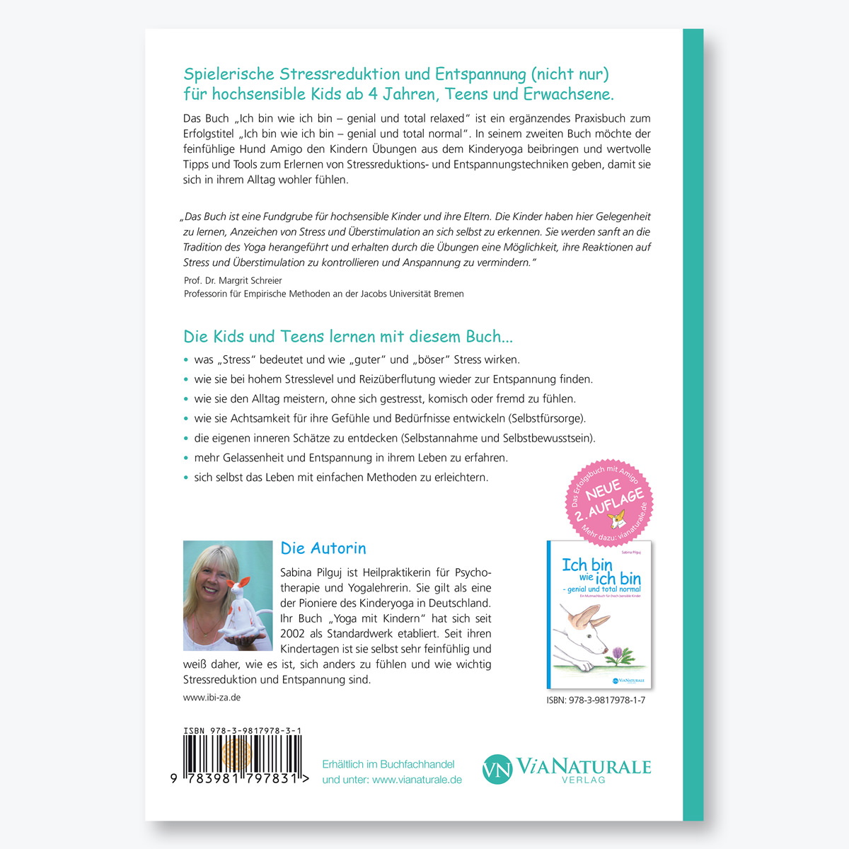 Spielerische Stressreduktion und Entspannung (nicht nur) für hochsensible Kids ab 4 Jahren, Teens und Erwachsene. Das Buch „Ich bin wie ich bin – genial und total relaxed“ ist ein ergänzendes Praxisbuch zum Erfolgstitel „Ich bin wie ich bin – genial und total normal“. In seinem zweiten Buch möchte der feinfühlige Hund Amigo den Kindern Übungen aus dem Kinderyoga beibringen und wertvolle Tipps und Tools zum Erlernen von Stressreduktions- und Entspannungstechniken geben, damit sie sich in ihrem A