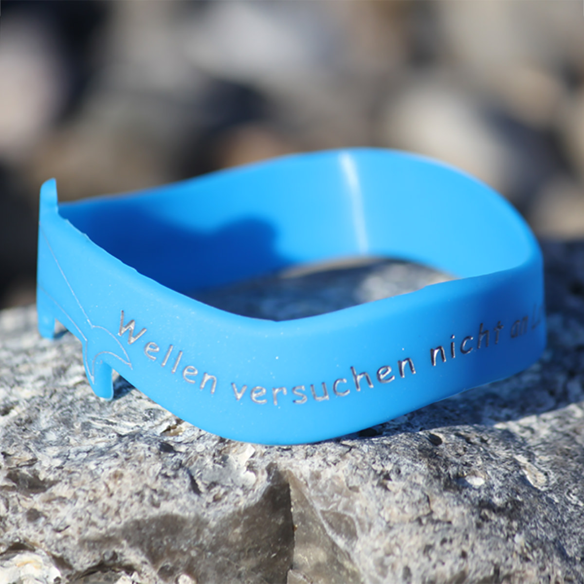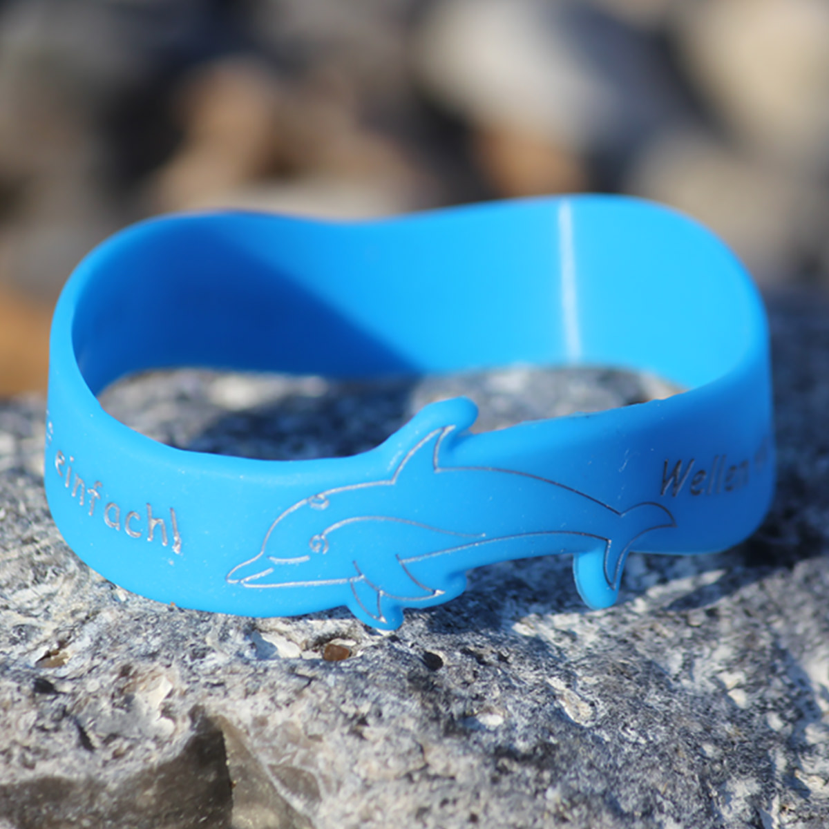 - Farbe: Blau, geprägtes Delfin-Motiv/Schrift Silber