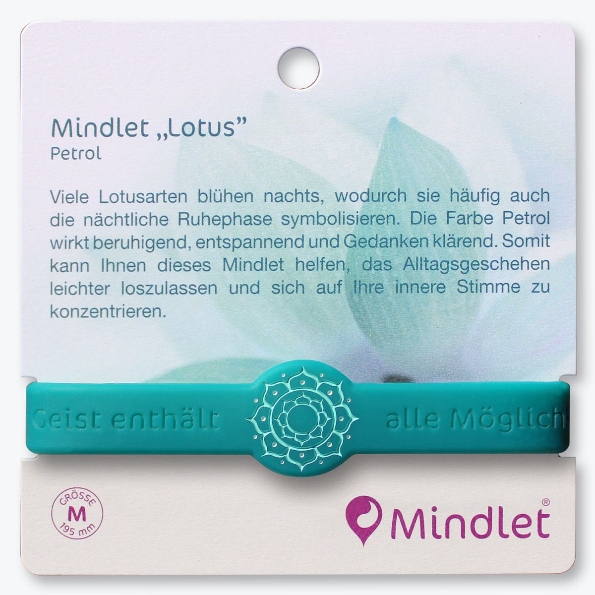 Viele Lotusarten blühen nachts, wodurch sie häufig auch die nächtliche Ruhephase symbolisieren. Die Farbe Petrol wirkt beruhigend, entspannend und Gedanken klärend. Somit kann Ihnen dieses Mindlet helfen, das Alltagsgeschehen leichter loszulassen und sich auf Ihre innere Stimme zu konzentrieren.