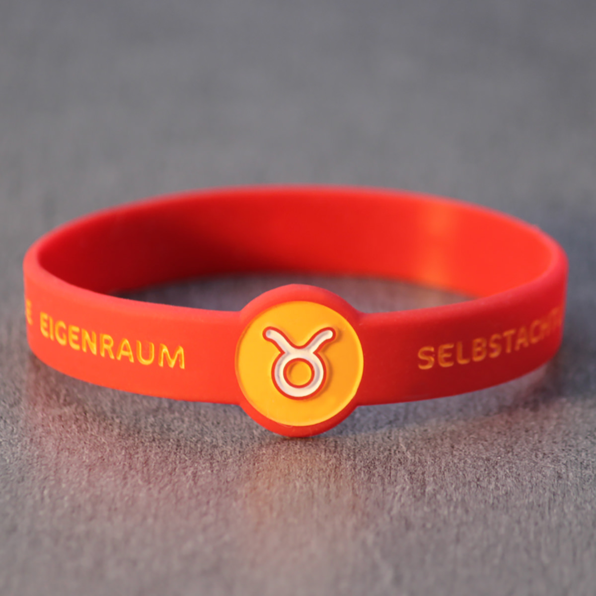 - Farbe: Rot-Orange, geprägtes Stier-Symbol Rot-Orange hell/Weiß